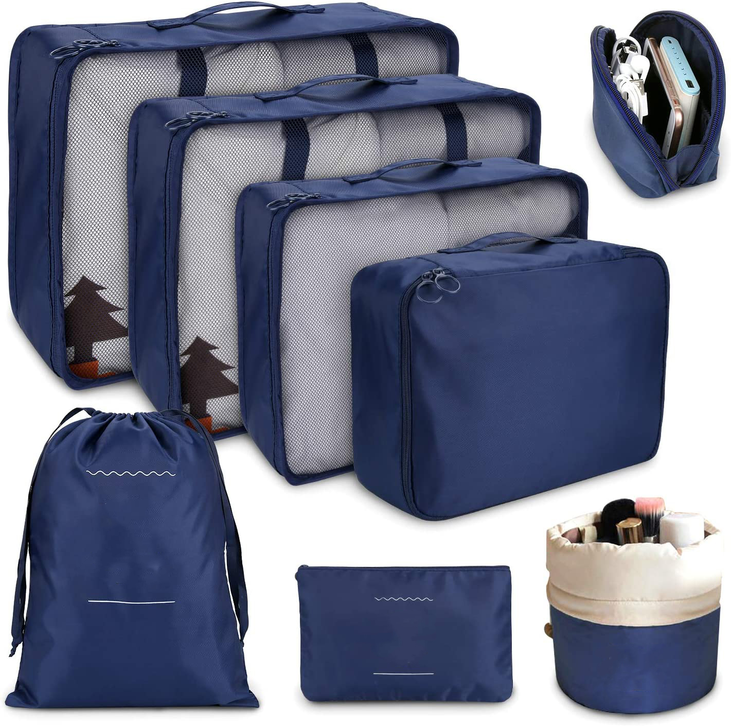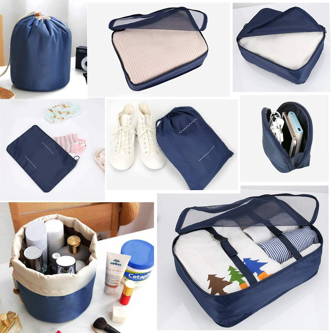 Domicile / Produits / Sac de voyage / Cubes d'emballage de voyage / 8pcs organisateurs de bagages organisateurs de voyage ensemble de voyage cube de voyage - 3 cubes pour l'emballage - 3 poches - 1 cube pour les sous-vêtements