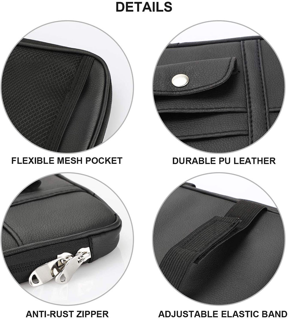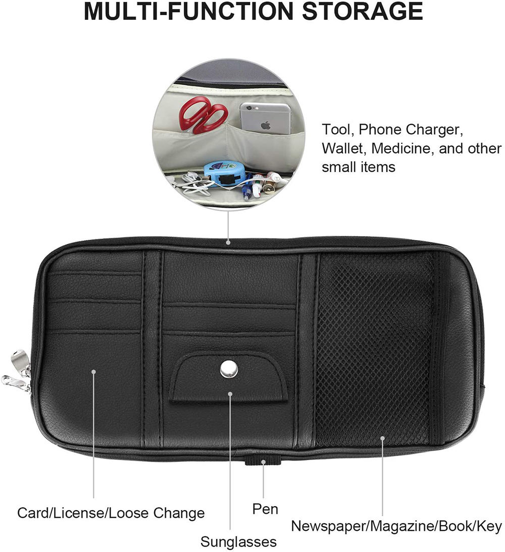 Plusieurs poches économisent de l'espace: 1 grand compartiment zippé, 1 poche filet, 5 emplacements pour cartes et 1 pince à lunettes.C'est un bon sac de rangement pour votre voiture.