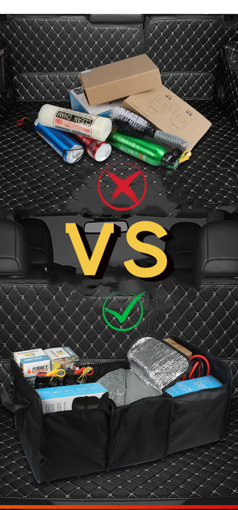 | Nom du produit | Conteneur de stockage de coffre de siège arrière de cargaison pliable de haute qualité Organisateur de coffre de voiture SUV Auto avec refroidisseur | ||||||