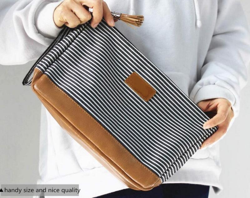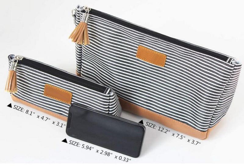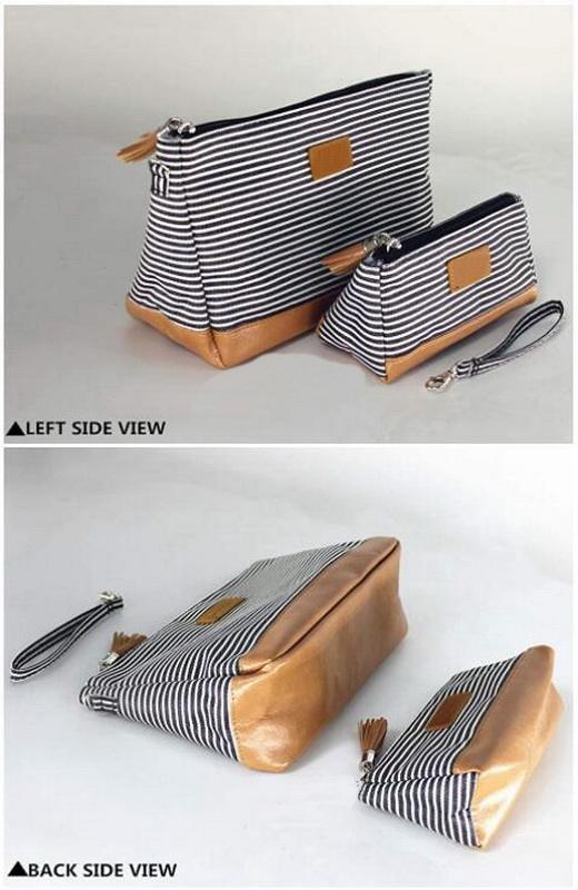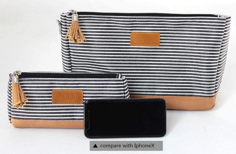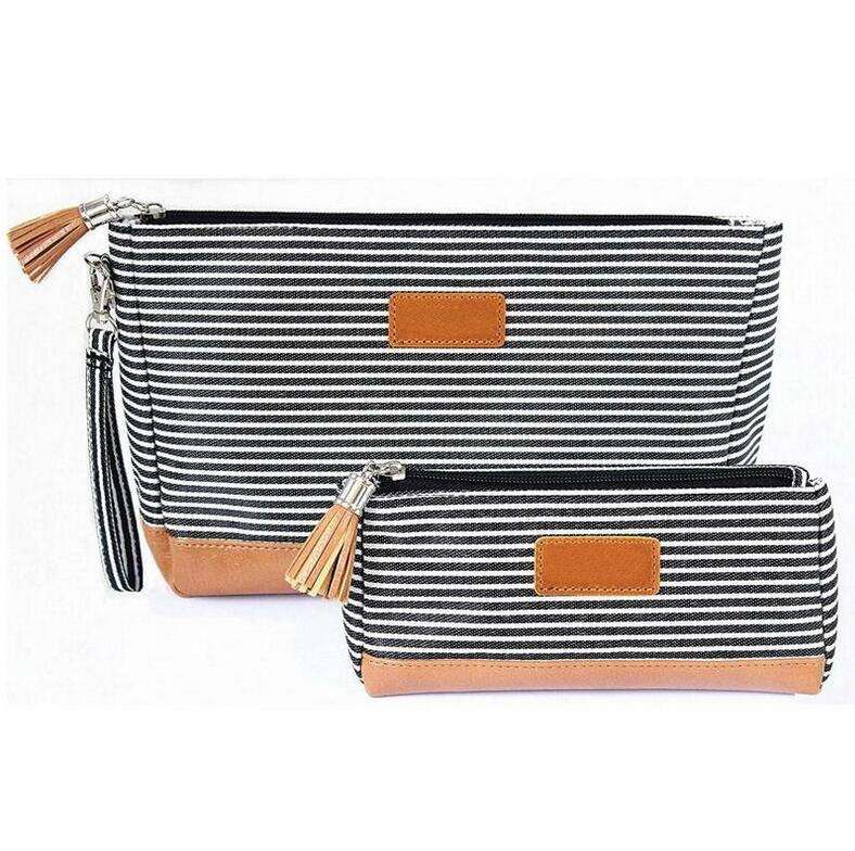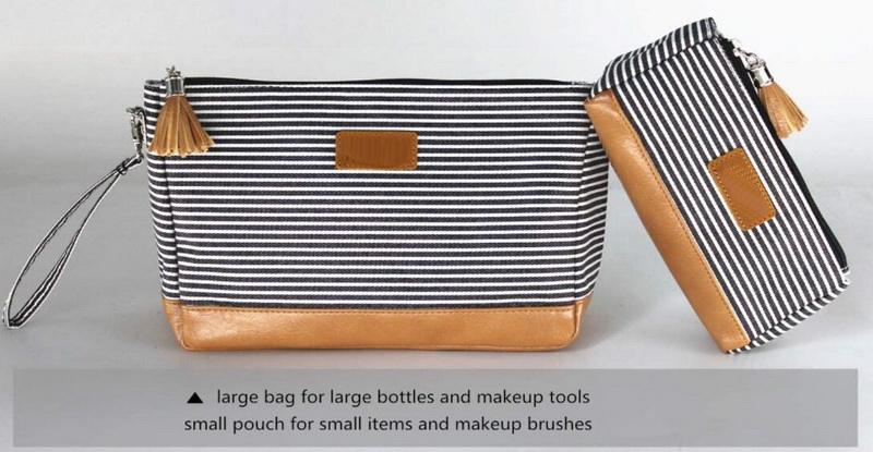 Domicile / Produits / Cosmétique et trousse de toilette / Trousse de maquillage / Femmes de luxe rayé costom mode pochette cosmétique maquillage brosse sacs voyage maquillage accessoires de toilette sac avec fond en cuir