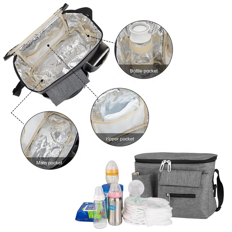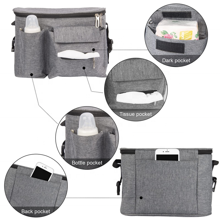 Domicile / Produits / Sac de voyage / Organisateur de voyage / Organisateur de poussette de bébé avec porte-gobelet et multi-poches, organisateur de poussette de stockage de jouets de bouteille de couche-culotte de style suspendu