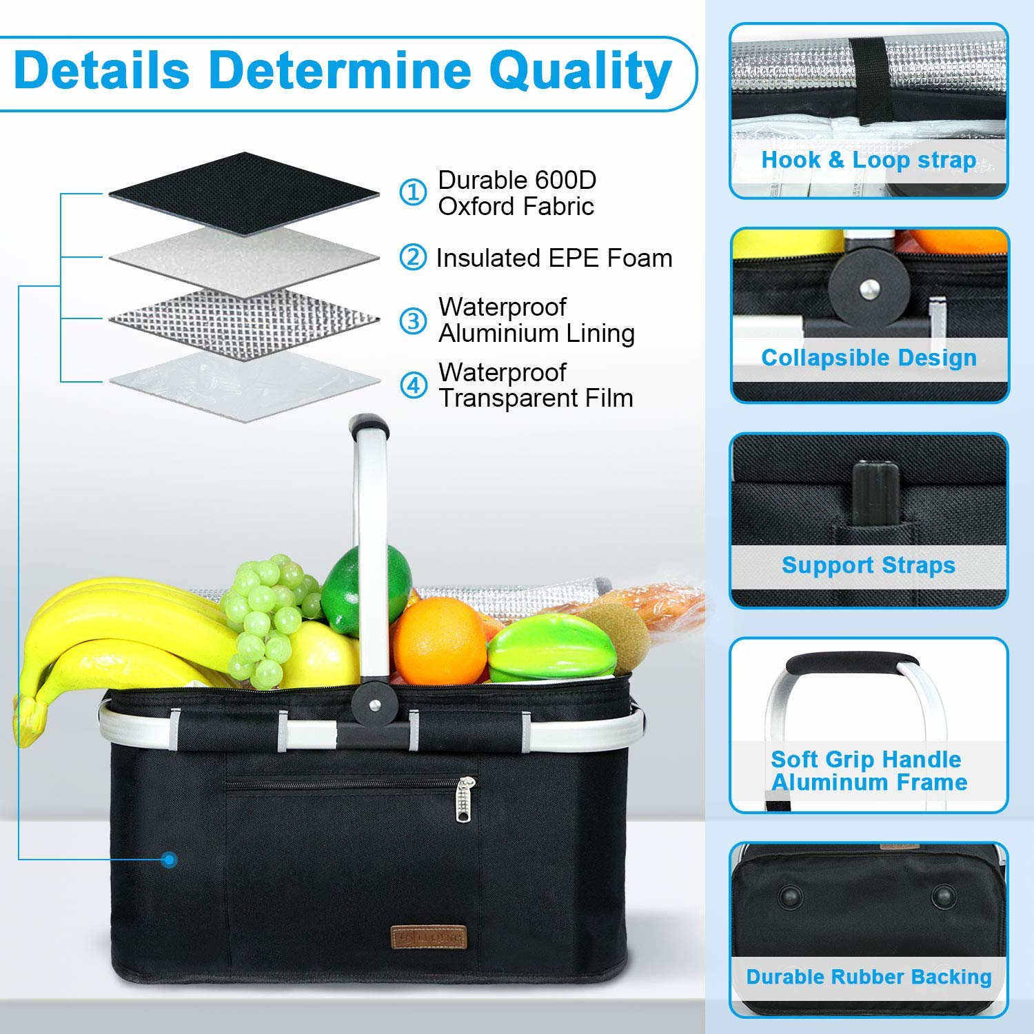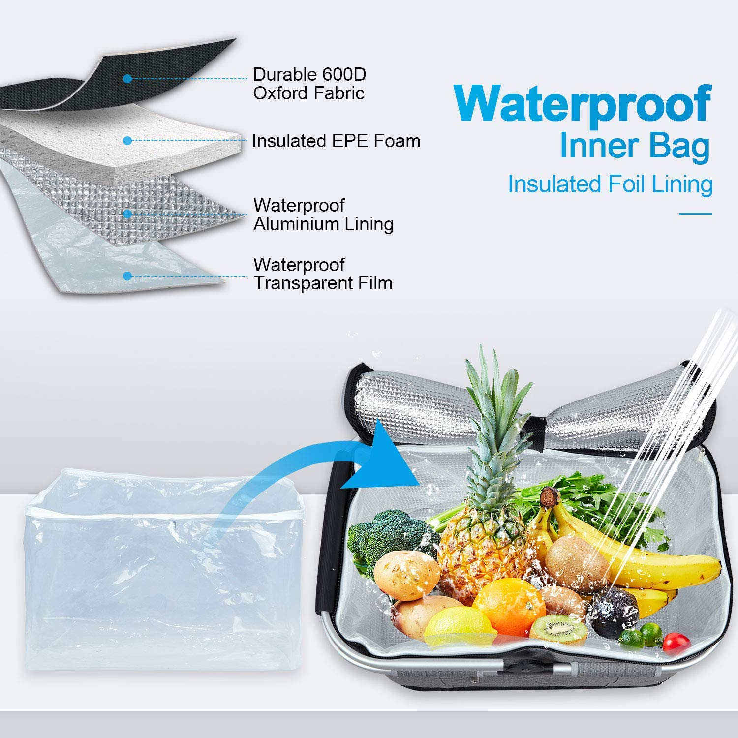 | Matériau principal | Matériau 300D/600D/1680D + mousse EPE + doublure PEVA/feuille d'aluminium |