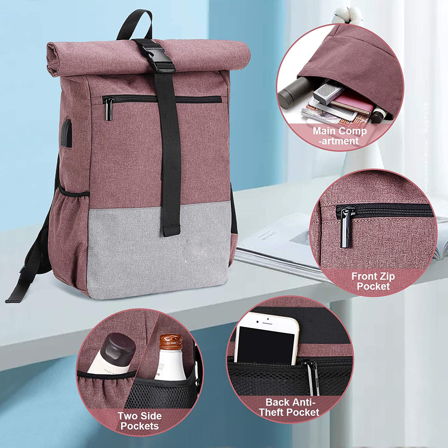 Sac à dos léger grand sac à dos de voyage Roll Top Daypack School Business sac à dos pour ordinateur portable avec port de charge USB