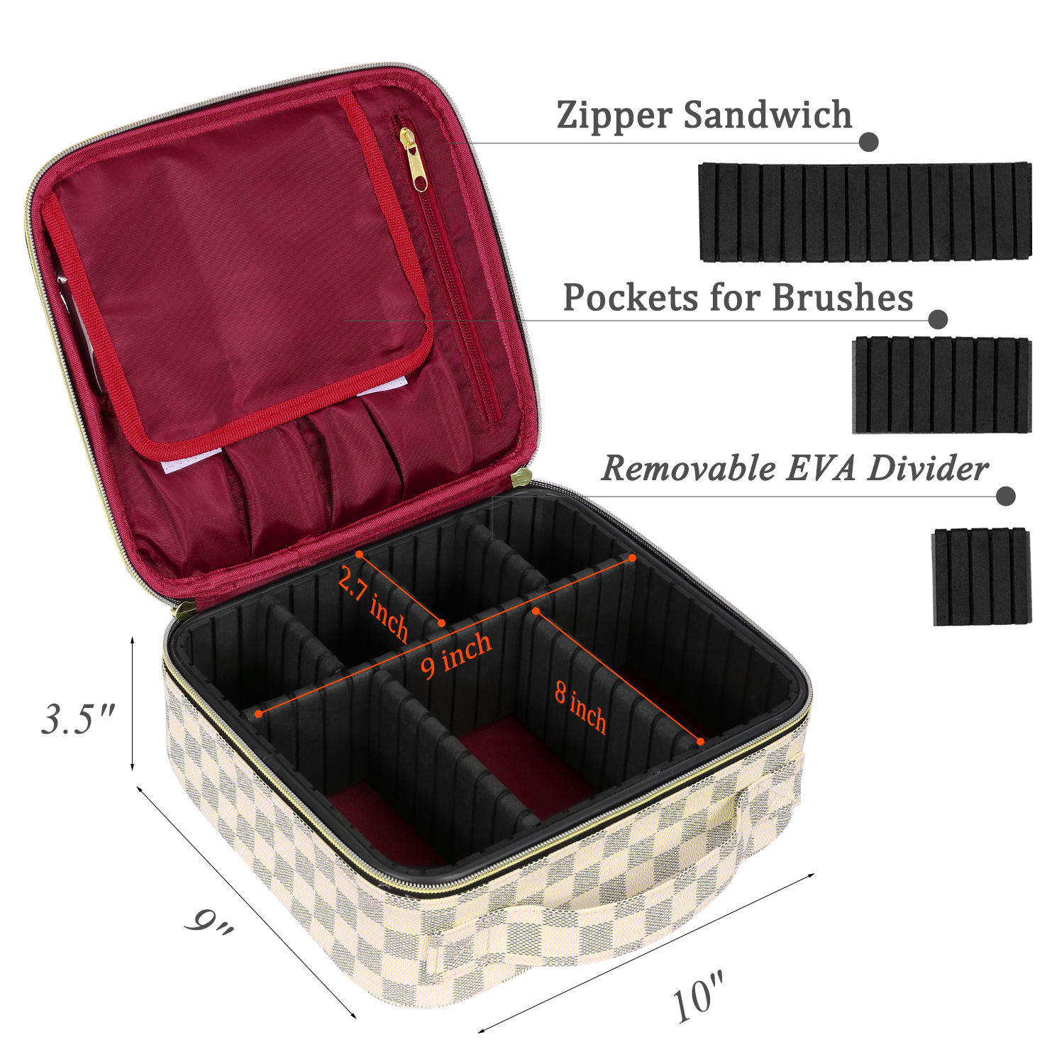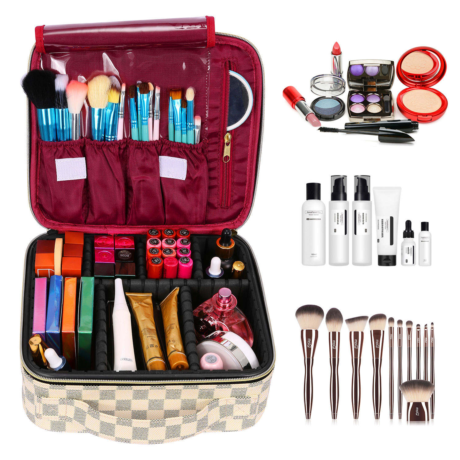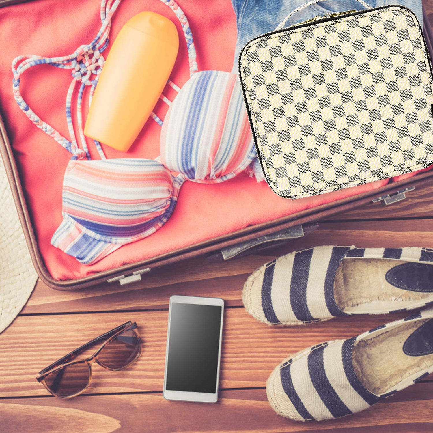 Domicile / Produits / Cosmétique et trousse de toilette / Trousse de maquillage / Sac cosmétique de voyage à carreaux marron résistant à l'eau de plus grande capacité organisateur de voyage sac de rangement de maquillage de toilette pour dames