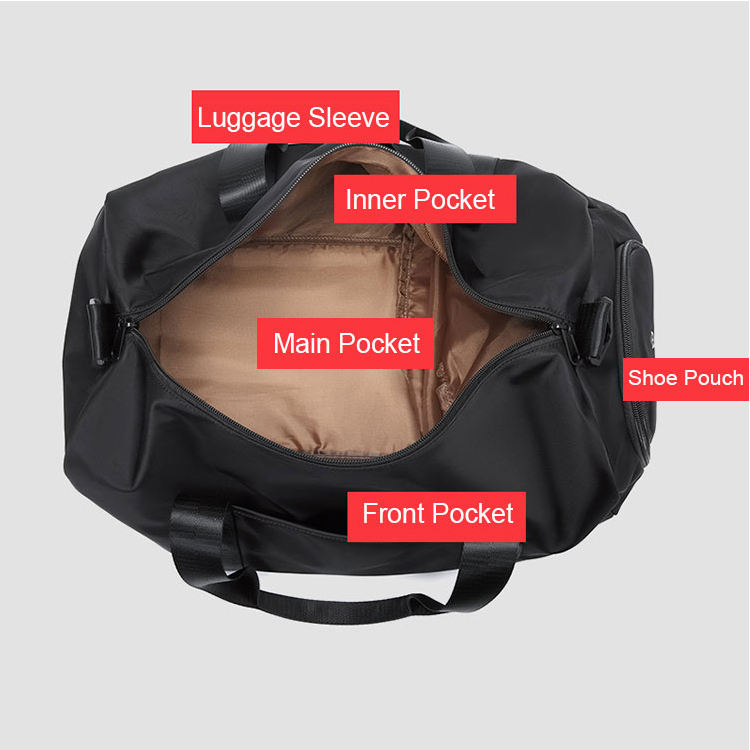 sac de sport à logo personnalisé avec sac de voyage en nylon imperméable à large ouverture avec poche humide et compartiment à chaussures